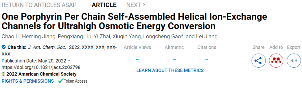 2022年5月20日,Journal of the American Chemical Society 在线发表了我院江雷院士、高龙成副教授团队在高效离子交换膜方面的最新研究成果:“One Porphyrin Per Chain Self-Assembled Helical Ion-Exchange Channels for Ultrahigh Osmotic Energy Conversion”。BBIN宝盈集团博士生李超为第一作者,高龙成副教授为通讯作者,BBIN宝盈集团为第一单位。