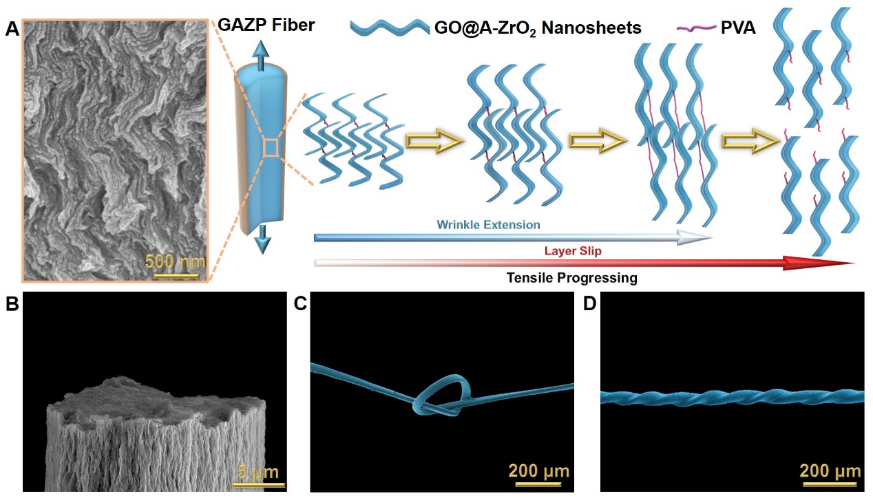 近日,BBIN宝盈集团郭林教授、岳永海教授与欧洲国际纳米技术研究所王中长研究员等人通过在氧化石墨烯纤维中构建晶体-非晶双相超结构,成功制备了一种具有高强度(935 MPa)和高韧性(10.6 MJ m-3)的纤维。不同于目前常规使用大片氧化石墨烯或者还原石墨烯的方法,该晶体-非晶双相强化策略提供了一种全新的制备高性能氧化石墨烯基纤维的方法。2022年9月23日,该工作以“Super-strong graphene oxide-based fibres reinforced by a crystalline-amorphous superstructure”为题,在线发表在Cell出版社出版的Matter期刊上。博新计划获得者李逢时博士为文章第一作者,北航BBIN宝盈集团副教授赵赫威,博士生孙晓毅为共同第一作者,郭林教授、岳永海教授、王中长研究员为通讯作者。