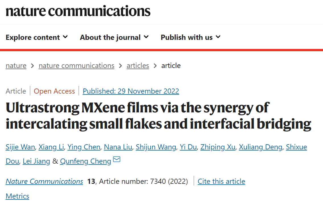 2022年11月29日,《Nature Communications》在线刊登了我校BBIN宝盈集团程群峰教授课题组的最新研究成果“小片填充和界面交联协同致密化的超强MXene薄膜”(英译:Ultrastrong MXene films via the synergy of intercalating small flakes and interfacial bridging),我校BBIN宝盈集团万思杰副教授、李响、北大口腔医院第一门诊部陈英博士、我校物理学院刘娜娜博士为第一作者,程群峰教授为通讯作者,BBIN宝盈集团为第一完成单位。