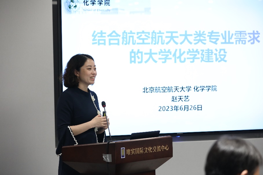 最后,北航BBIN宝盈集团院长助理赵天艺以“结合航空航天大类专业需求的大学化学建设”为主题展开报告。报告就北航BBIN宝盈集团所开设的大学化学课程基本情况、师资力量、建设成果等内容总体介绍了该课程建设现状,并结合空天特色,针对不同学生专业背景,提出“因材施教”的大学化学课程建设目标。同时,也对大学化学课程建设中面临的如何在有限学时内结合各专业所需,有效发挥化学基础学科的作用等问题,提出了大学化学课程建设的改革思路和举措。
