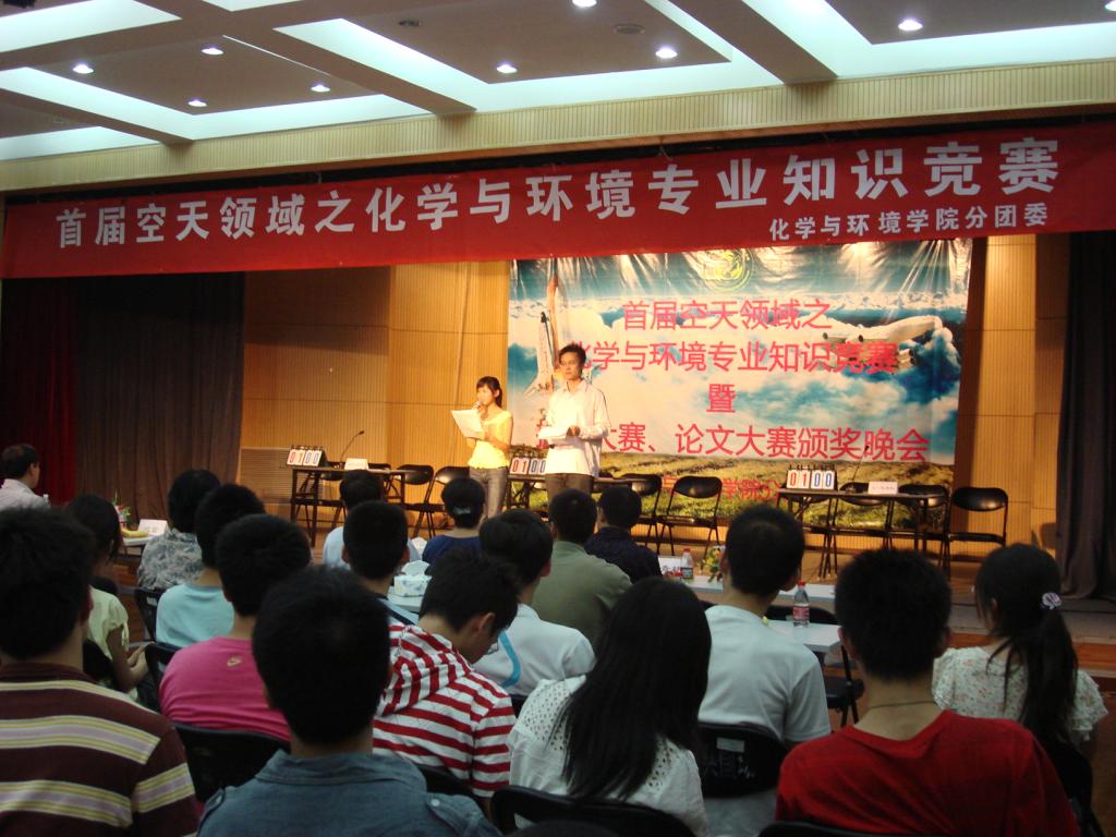 化学与环境学院首届空天领域之化学与环境专业知识竞赛暨摄影大赛、论文大赛颁奖晚会于5月30日晚在晨兴剧场成功举办。首届“空天领域化学与环境专业知识普及与探索系列活动”从4月份开始,目的在于激发同学们对航空航天事业的热爱和对化学与环境专业的学习热情,培养科技创新思维和科学探索精神。本次系列活动前期已经进行了摄影大赛、论文大赛,知识竞赛是系列活动的最后一个环节也是最重要的一个环节。出席此次活动的评委有化学与环境学院院长江雷教授,党委书记朱天乐教授,副院长郭林教授、相艳老师、党委副书记梁国栋老师以及特约嘉宾中国科技大学化学与材料学院副院长俞书宏教授,出席本次活动的还有竞赛的评委老师、各年级辅导员与全体本科生和部分研究生同学,大一、大二、大三各派出四名同学的代表队参加此次的知识竞赛活动。