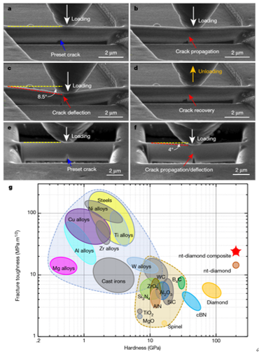 | 上图为:纳米孪晶复合金刚石及纯孪晶相金刚石材料的原位弯曲变形过程及与其他工程材料硬度和断裂韧性的比较。 |