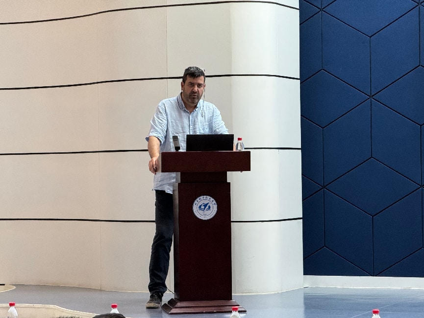 Jorge A. Mendes教授带来题为“Studies of magnetic, multiferroic and superconducting thin films”的学术报告。Mendes教授是葡萄牙波尔图理工大学工程学院的资深学者,在高等教育与科学研究领域深耕不辍。在讲座中,Mendes教授深入浅出地介绍了薄膜材料领域的最新研究成果。他分享了有关低温溅射颗粒状Co-Ag薄膜的研究,探讨注入放射性离子的薄膜超导转变温度及电阻率等问题。除此之外,Mendes教授还介绍了多铁性薄膜和多层膜结构的研究进展,揭示了由于磁序和电序的存在而产生的磁电耦合效应,为在场师生提供了材料科学前沿的全新视角。